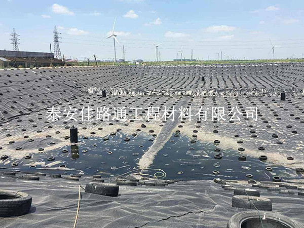 铺设完土工膜后,应采用适当的压块(如水泥方砖、汽车轮胎等)将其压好,防止被风吹散。